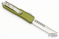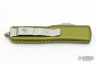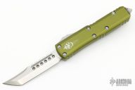 This UTX-85 by Microtech features a stonewashed tanto blade with satin flats and fullers. The handle has a OD Green aluminum frame with blasted hardware and tip down clip. S/N 442 and dated 11/2022. Comes with original box and papers. Excellent condition.
