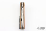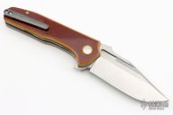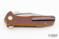 This Overlord linerlock flipper by Michael Shiffer features a tumbled blade with thumbhole, fullers and flipper, and fileworked thumbrest. The handle has Vintage Butterscotch linen micarta scales and pivot collars, tumbled titanium liners, Vegas Forge Damascus backspacer and tip up clip. Nice detent, lockup and blade seating, rides on bearings. Comes with COA. New from maker.