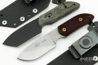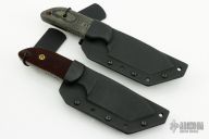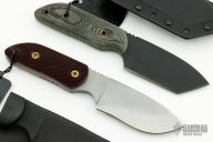 This pair of Strikars by Tops knives, one of them has a black tanto blade and one has a matte finished blade with what appears to be a visible temper line, notched thumbrest, one has black linen micarta scales with white liners and the other has checkered wood scales with black liners. Both come with original sheaths. Have some light scratches, otherwise they are in excellent condition.
