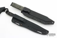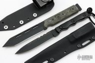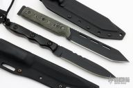 This pair of Tops knives, one of them has a black tanto blade and one has a black drop point blade, notched thumbrest, one has black linen micarta scales with white liners and the other has black G-10 scales with red liners. Both come with original sheaths. Have some light scratches, otherwise they are in excellent condition.