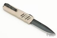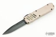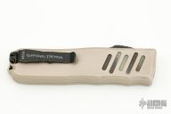 This Recon-035 by Guardian Tactical features a dark washed drop point blade. The handle has a desert tan aluminum frame with black hardware and a black stainless steel pocket clip. Has some scuffs, otherwise good condition.