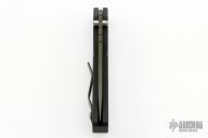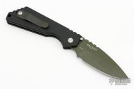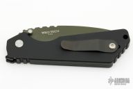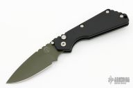 This Pro-Strider SNG by Pro-Tech and Strider Knives features a green blade with notched thumbrest. The handle has a black aluminum frame with black hardware and black stainless steel tip up clip. Excellent condition.