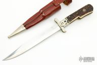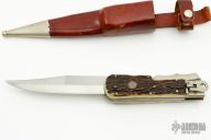This leverlock swing guard folding boot knife by Ed Wusthof features a polished blade with false top edge. The handle has a folding nickel silver guard, stag scales, brass liners and a steel backspacer. Includes a brown leather and nickel silver sheath. Has some scratches, otherwise good condition for its age.