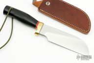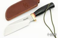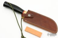 This Chef's Knife by Randall Made Knives features a satin finished blade with notched thumbrest, .236" blade stock and 1.680" blade depth, hidden tang construction. The handle has a brass guard, red spacers, black linen micarta with a comfortable handle grip, wrist thong. Designed for kitchen use. Comes with a brown leather sheath and original papers. Excellent condition.