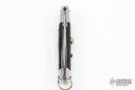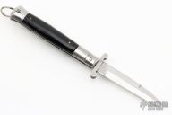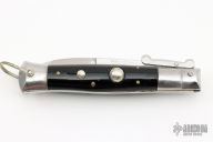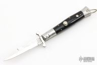This Swing Guard Stiletto Auto has a mirror polished stainless steel spear point blade with false top edge. Handle is black acrylic with stainless steel bolsters and liners, brass auto button and safety button, and aluminum bail. Has scratches, otherwise good condition.