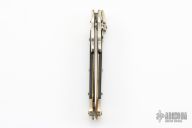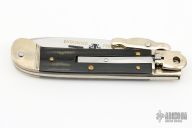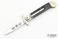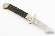 The Guardian by Hubertus Knives features a mirror finish blade, nickel silver guard, bolsters, release, and pins, black linen micarta scales, and brass liners. Smooth, quick opening. Strong lockup. Has a couple light scratches, otherwise excellent condition. Dated 2002 and #191 of 200