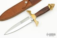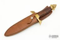 This Dagger by Gil Hibben features a mirror polished double edged blade with .230" blade stock and 1.498" blade depth, hidden tang construction. The handle has a brass guard and butt with a cocobolo grip and black/brass spacers. Comes with a brown leather sheath. Has a couple very light scratches, otherwise excellent condition. Silver Dollar City, MO Era