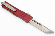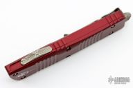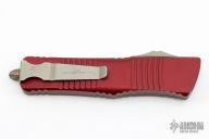 This Combat Troodon by Microtech Knives features a bronzed Hellhound blade with satin flats. The handle has a red aluminum frame with tip down bronzed stainless steel clip and hardware. Comes with original box and papers. 03/2020. Excellent condition.