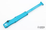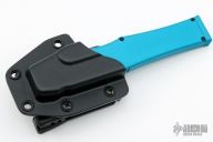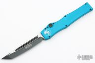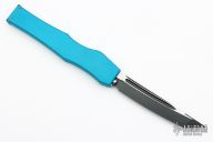 This Halo V OTF by Microtech has a black tanto blade with standard edge. The handle is turquoise aluminum with black hardware. Comes with original box, kydex sheath and papers. Dated 08/2015 and serial number 14895. Excellent condition.
