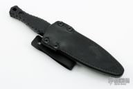 This Galvo Dagger by Les George features an Black ceracoated double-edged blade with .170" blade stock and .894" blade depth, full tang construction. The handle has black Diamond G-10 scales and a lanyard hole. Comes with a black leather sheath by Chatanooga Leatherworks. Comes with zipper case. Excellent Condition.