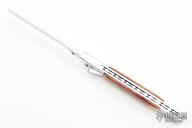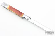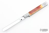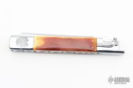 This Picklock Auto by Agasi Hambartsumian of Armenian Doctor Knives features a mirror polished blade. The handle has a polished stainless steel frame with fileworked stainless steel backspacer, dyed giraffe bone scales with brass pins. New from maker.