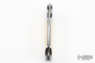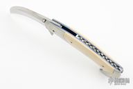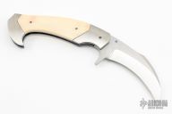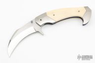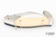 This Pinterhawk Prototype by Reese Weiland features a mirror finished hawkbill blade with satin flats, single checkered thumbstud and a flipper. The handle has stainless steel bolsters, mammoth ivory scales, anodized titanium liners with jeweled interiors, and a fileworked stainless steel backspacer. Nice lockup and blade seating. Comes with a zippered case. Has a few light scratches, otherwise excellent condition.