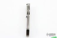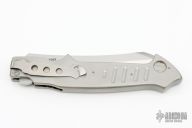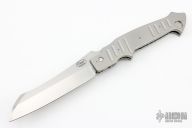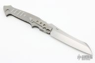 This "Hew Chopper" XL Linerlock by Keith Ouye features a hand rub satin finished blade with false top edge and flipper. The handle has a satin finished titanium scales, titanium liners with jeweled interiors, satin finished titanium tip down clip, titanium backspacer. Nice detent, lockup and blade seating. Super smooth on bronze washers. Comes with a zippered case. Has a couple light scratches, otherwise excellent condition. This knife was featured in an issue of Blade Magazine and can be viewed in the "Folder Gallery" on Keith Ouye's website.