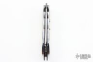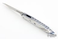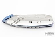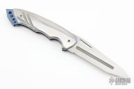 This Nighthawk M Auto by Reese Weiland features a mirror polished blade with satin flats and notched thumbrest. The handle has mirror polished stainless steel scales, anodized and jeweled titanium liners, and a fileworked stainless steel backspacer. Nice action, lockup and blade seating. "RW Nighthawk M 001" inside backspacer. Comes with zippered case. Has a couple light scratches, otherwise excellent condition.