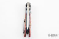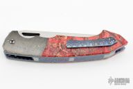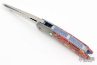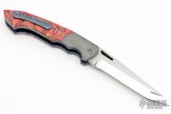 This Fatty XXL Nighthawk Auto by Reese Weiland features a mirror polished blade with satin flats, . The handle has dovetailed Damascus bolsters, dyed and stabilized box elder burl scales, anodized and jeweled titanium liners, stainless steel backspace with mokuti inlays, zircuti tip up clip. Nice action, lockup and blade seating. "RW PROTO" inside backspacer. Comes with zippered case. Excellent condition.