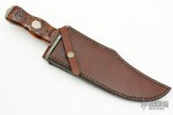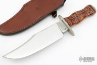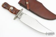 This Bowie by Master Smith Hanford J Miller (this one wears his Journeyman Smith stamp) features a mirror polished blade with sharpened clip, .337" blade stock and 2.248" blade depth, hidden tang construction. The handle has a fileworked nickel silver guard and butt with fileworked nickel silver tang nut, curly maple grip with silver wire inlays. Comes with brown leather sheath. Has some light scratches and a couple small spots on the blade, otherwise excellent condition. Bill Moran told him that Handford was his best student.