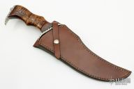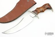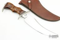 This ST-23 by Master Smith Hanford J Miller features a mirror polished blade with a nearly sharpened clip, .295" blade stock and 2.219" blade depth, hidden tang construction. The handle has a fileworked nickel silver guard and butt with fileworked nickel silver tang nut, curly maple grip with silver wire inlays. Comes with brown leather sheath. Has some light scratches and a couple small spots on the blade, otherwise excellent condition. Bill Moran told him that Handford was his best student.