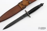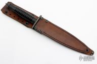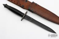 This Dagger by Mick Strider features a double edged black blade with fullers, .249" blade stock and .877" blade depth, hidden tang construction. The handle has a flamed titanium guard and butt with black aluminum grip. Has some scuffs and scratches, otherwise good condition. Comes with a brown leather sheath by Chattanooga Leatherworks.