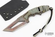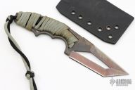 This POGN fixed blade by Bawidamann Blades has a "camo" acid etched S35VN stainless steel double edge drop point/ tanto skeletonized blade with notched thumbrest. Handle is paracord wrapped, with contoured finger "choils" and lanyard. Has some scuffs and scratches, has a couple small nicks in the edge, otherwise good user condition. Comes with kydex sheath.