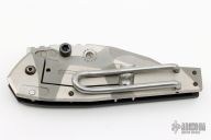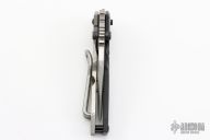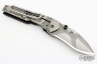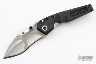 This Tripwire II framelock folder by the Late Dwaine Carrillo features a two-tone, spearpoint recurve blade with notched thumbrest and dual thumbstuds. The handle has a black G-10 and two-tone titanium frame. Stainless steel clip. Has been resharpened, probably on a Wicked Edge or something similar, has mirror polished edge, but it isn't very sharp, has scuffs and scratches, has been used and carried, otherwise good user condition.