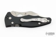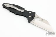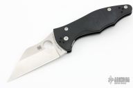 This Yojimbo 2 by Spyderco features a satin finished wharncliffe blade with thumbhole. The handle has a black G-10 frame with stainless steel liners, lock is on the spine of handle. 4-way reversible stainless steel clip. Nice detent, lockup and blade seating. Comes with original box and papers. New condition. Knife Center Exclusive.