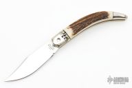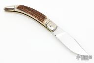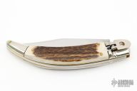 This Diana by AGA Campolin features a mirror polished blade. The handle has nickel silver bolsters and lever release, stag scales, brass liners, stainless steel backspacer. Nice action, nice lockup and blade seating. Excellent condition. Dated 2016. Comes with leather belt sheath.