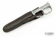 During WWI the firm of Robbins Dudley filled the “Tommy’s” need for easy to use in close quarters fighting knives. Designed for easy manufacture, these knives were all private purchase by individual soldiers. This Knuckle Knife was designed for stabbing in both grips, with the high carbon steel blade. Comes with original brown leather holster. Has some light scratches and patina, otherwise excellent condition for its age.