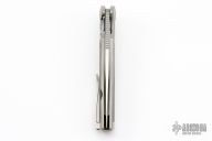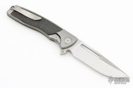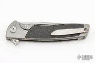 This Mini EVO Flipper from Brian Nadeau features a belt satin finished blade with a fullers, thumbhole, flipper and notched thumbrest. The handle is comprised of a bead blasted titanium frame with carbon fiber inlays, satin titanium tip up clip. Rides on bearings, nice detent, lockup and blade seating, stainless lockface insert. Comes with original box. New from maker!