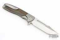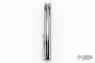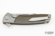 This Mini EVO Flipper from Brian Nadeau features a belt satin finished blade with a fullers, thumbhole, flipper and notched thumbrest. The handle is comprised of a bead blasted titanium frame with green canvas micarta inlays, satin titanium tip up clip. Rides on bearings, nice detent, lockup and blade seating, stainless lockface insert. Comes with original box. New from maker!