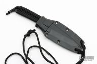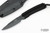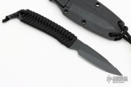 This Helium by R&N Blades features a Black Cerakote blade with notched thumbrest, .102" blade stock and .763" blade depth, full tang construction with paracord wrapped handle. Comes with a molded plastic sheath. Excellent condition.