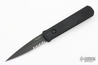 This 921 SWAT Godfather features a black partially serrated blade. The handle has a black aluminum frame with black hardware, black push button and black stainless steel tip up clip.  Includes the original box and papers.  Excellent Condition.