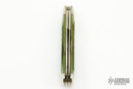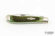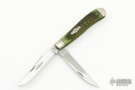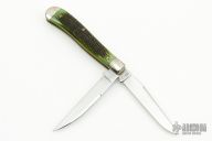 This Trapper by Great Eastern Cutlery features two satin finished blades both with long pull nail nicks and false top edges. The handle has nickel silver bolsters and butt, green bone covers with nickel silver escutcheon, brass liners, and a stainless steel spring. Has half-stop. Comes with original tube. Excellent condition.