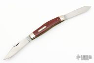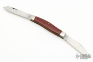 This knife by Great Eastern Cutlery features 2 satin finished blades with nail nicks. The handle has nickel silver bolsters, escutcheon, red linen covers, brass pins and liners with stainless springs.  Comes with original tube and wax paper.  Excellent Condition.