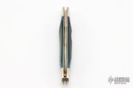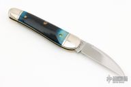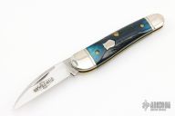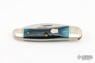 This Little Rattler by Great Eastern Cutlery features a satin finished blade with nail nick. The handle has pinched and fluted nickel silver bolsters and brass liners, blue bone covers. Comes with original packaging. Excellent condition.