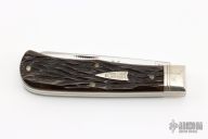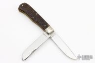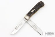 This Trapper by Great Eastern Cutlery features two mirror polished blades both with nail nicks and false top edges. The handle has nickel silver bolsters, jigged bone covers with nickel silver escutcheon, brass liners, and stainless steel springs.  Comes with original box. Excellent condition.