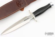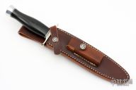 This Model 2-7 by Randall Made knives features a satin finished double edged blade, .229" blade thickness and 1.286" blade depth, hidden tang construction. The Model 2 is a heavily made dagger or dirk. Nickel silver guard and duralumin butt, black linen micarta grip with black/duralumin spacers. Comes with a brown leather sheath and original paper wrapping. New from maker.