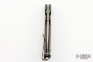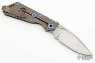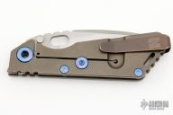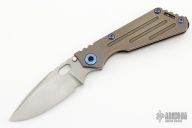 This Mick Strider Performance series SNG framelock folder features a silver coated spear point blade with thumbhole and notched thumbrest. The handle has a milled and anodize finished titanium frame with titanium deep carry clip, tip up carry. Jimping on blade spine. Includes Hinderer "Lock Bar Stabilizer" for maximum reverse lock retention. Excellent lockup, detent, and blade seating. Has a couple light scuffs and scratches on the clip and frame, otherwise excellent condition.