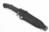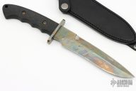 This Pike Logan Fighter by Allen Elishewitz features an antique finished blade with sharpened top edge, .252" blade stock and 1.488" blade depth, full tang construction. The handle has an anodized titanium guard and black G-10 scales with antique finished tang. Comes with a black leather sheath made by SoulBound leather. Comes with COA. New from maker at the 2023 Blade Show Texas.