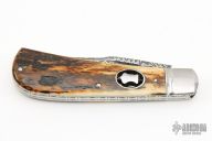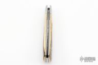 This Single Blade Trapper by Chris Sharp features his Patent Pending see-through escutcheon. This knife has a 1084/15N20 Damascus blade with nail nick. The handle has 416ss bolsters with integral liners and escutcheons, mammoth covers, filework on liner spines, stainless steel spring. Has half-stop, flush in all positions. Comes with zippered case. New from maker at the 2023 Blade Show Texas.