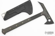 This BSC-T Tactical Tomahawk features a black S7 steel blade with full tang construction, .262" blade stock. The handle and head have carbon fiber overlays with anodized titanium hardware. Has notches on the tang in all the right places! Comes with a kydex sheath with titanium logo plate with hole for removing the sheath. Comes with original box and COA dated "Microbatch 2023". New from maker at the 2023 Blade Show Texas.