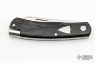 This Native TL by Jared Oeser features a hand rub satin finished blade with nail nick. The handle has Westy Wood covers with stainless steel escutcheon/pivot collar, purple and gray G-10 liners, stainless spring with tabs on tail. Mokuti backspacer. Nice lockup and blade seating. Comes with original box (a little beat up), leather slip sheath and COA dated 6/2/21. Excellent condition.