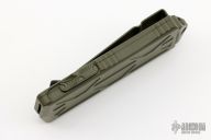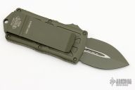 This Microtech Exocet features a green finished double-edged blade. The handle has a green aluminum handle and a black finished stainless clip that doubles as a money clip dated 08/2022 s/n 21205. Comes with original box and papers.  Excellent condition.