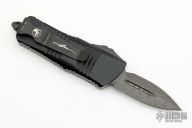 This Troodon Mini OTF automatic by Microtech knives features a Damascus double-edged blade, and a carbon fiber and aluminum handle with black ringed hardware, tip down stainless steel carry. Glass breaker. S/N 189. Dated 08/2022. Comes with original box and papers. Excellent condition.
