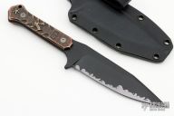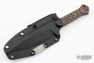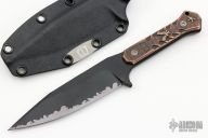 This Fedele X by Blackside Customs features a Sumi finished blade with notched thumbrest, .197" blade stock and 1.178" blade depth, full tang construction. The handle has copper Starlingear scales with blasted titanium hardware. Comes with a kydex sheath with logo plate and soft loop, original box and COA dated "Micro Batch 2023". New from maker at the 2023 Blade Show Texas.