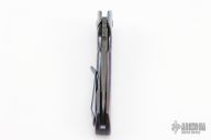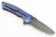 The Hyrax flipper by Defiant7 Knives has a Chad Nichols MokuTi frame with an anodized and stonewashed titanium pocket clip and blue anodized pivot and notched backspacer. The blade is Chad Nichols Rain Drop Damascus with a notched thumbrest and flipper. Nice detent, lockup and blade seating. Rides on bearings. Comes with cloth case. New from maker at the 2023 Blade Show Texas.
