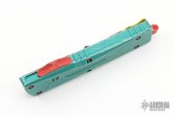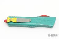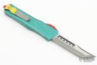 This Combat Troodon Bounty Hunter by Microtech Knives features a Hellhound tanto blade with fullers, satin flats and apocalyptic finished grinds. The handle has a green battle worn aluminum handle with red hardware, tip down apocalyptic finished stainless steel clip.  Includes the original box and papers.  Excellent condition. Dated 01/2023 s/n 2751.