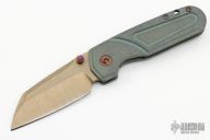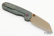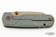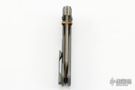 This Tempest by Jason Stout features a bronzed tumbled chisel ground wharncliffe blade with dual anodized titanium thumbstuds and notched thumbrest. The handle has a milled, anodized and tumble finished titanium frame with matching titanium clip for tip up carry. Nice detent, lockup and blade seating. Comes with COA and Dragoncut knife pouch. New from Blade Show Texas 2023!