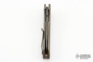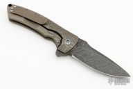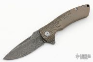 The Hyrax flipper by Defiant7 Knives has an engraved titanium frame with a matching titanium pocket clip and two-tone anodized pivot, notched backspacer. The blade is Chad Nichols Rain Drop Damascus with a notched thumbrest and flipper. Nice detent, lockup and blade seating. Rides on bearings. Comes with a zippered case. New from maker at the 2023 Blade Show Texas.