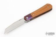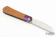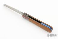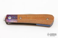 This Raptor Front Flipper by Enrique Pena features a hand rub satin finished wharncliffe blade with swedge, notched thumbrest and front flipper. The handle has Mokuti bolsters, natural canvas micarta scales, blasted and anodized titanium liners, anodized titanium backspacer. Includes padded and zippered case. New from maker at the 2023 Blade Show Texas.