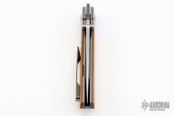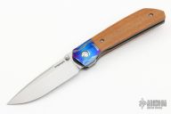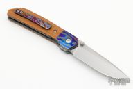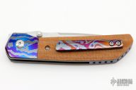 This Mula Front Flipper by Enrique Pena features a hand rub satin finished drop point blade with swedge, notched thumbrest and front flipper. The handle has zircuti bolsters with natural canvas micarta scales, and a tip up zircuti clip and an anodized titanium backspacer. Nice detent, lockup and blade seating. Comes with zippered case. New from maker at the 2023 Blade Show Texas.